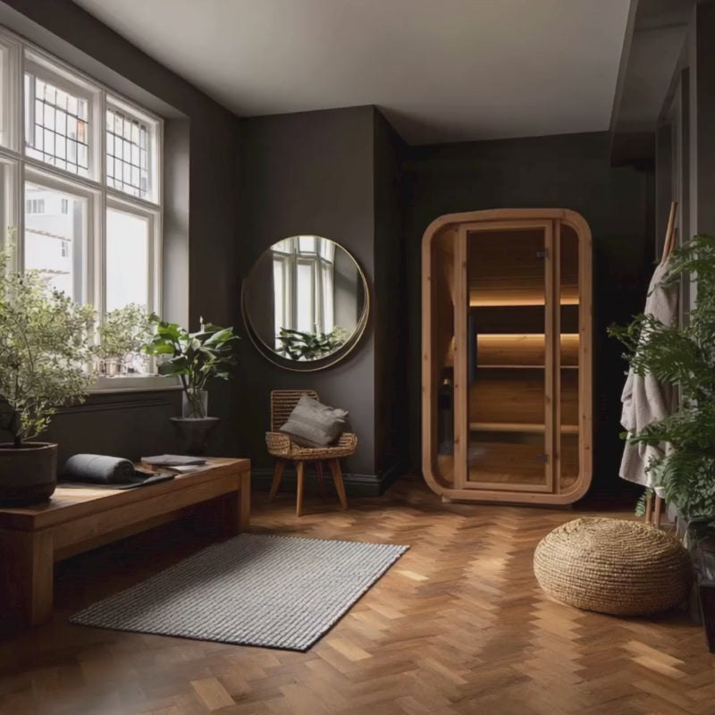 The Thermo Wood Cube Indoor Sauna solves the space problem. This compact 2-person sauna delivers an authentic experience without demanding half your home. The curved cube design isn't just distinctive; it ensures even heat distribution and faster warm-up times than traditional rectangular cabins.