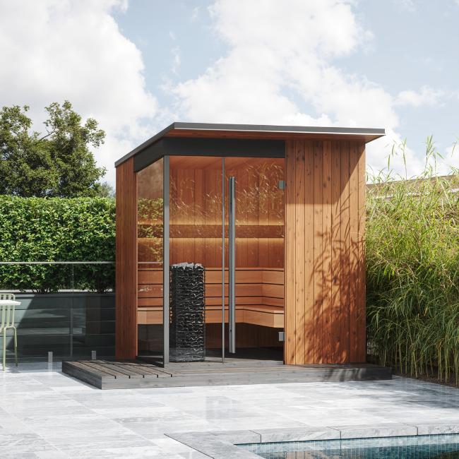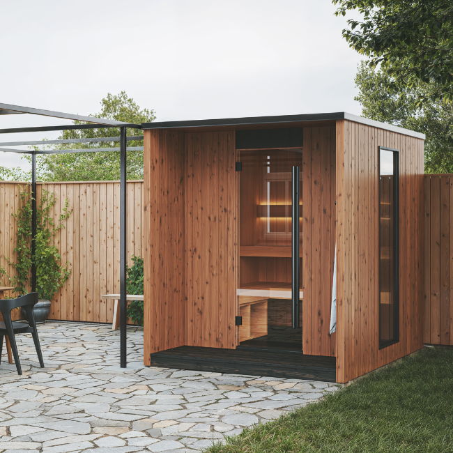 The Aira® Outdoor Sauna offers a sleek angled roof, spacious seating for 4-6 people, and a sociable opposing bench layout. Designed with expert craftsmanship, it blends functionality and comfort to create the perfect addition to your outdoor space.